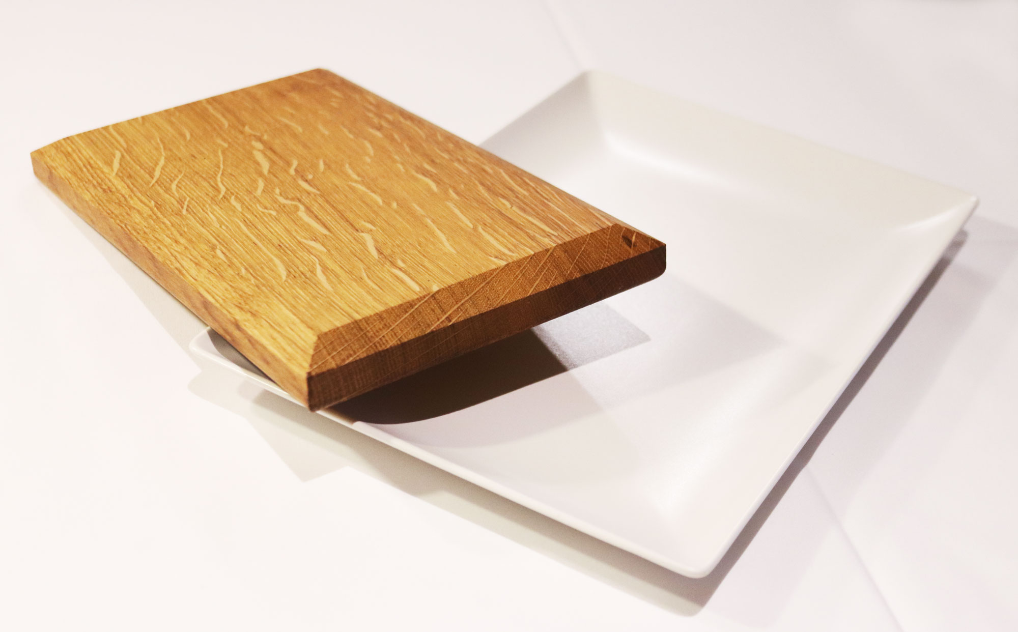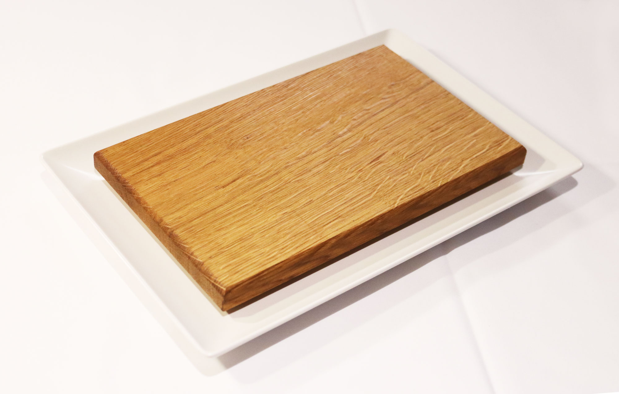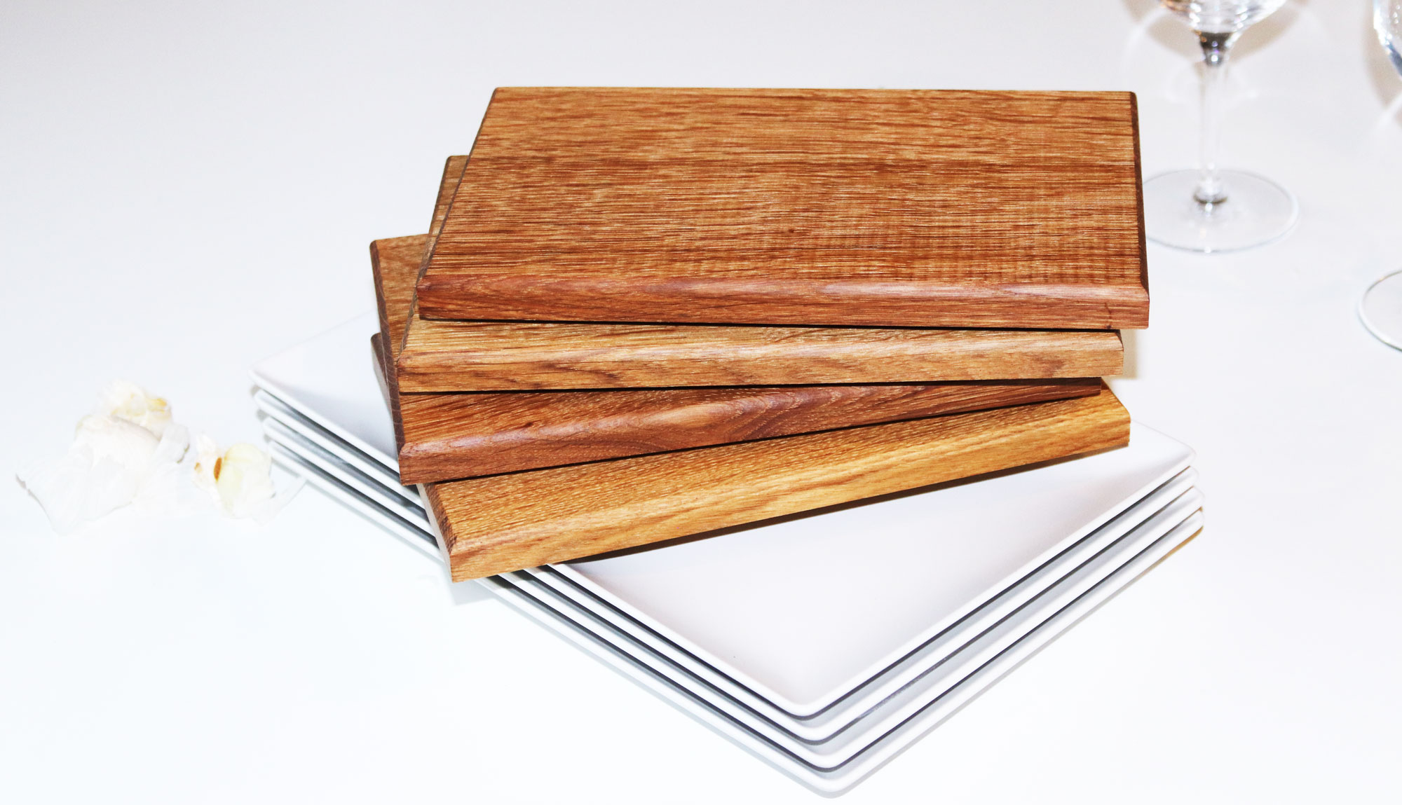 Fire smukke, rektangulære planker af bornholmsk egetræ med tilhørende tallerkner.